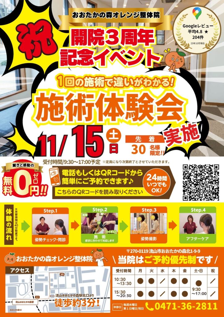 つきましては、記念イベントとしまして無料施術体験会を行います!限定30名様募集中です。是非この機会にご来院ください!